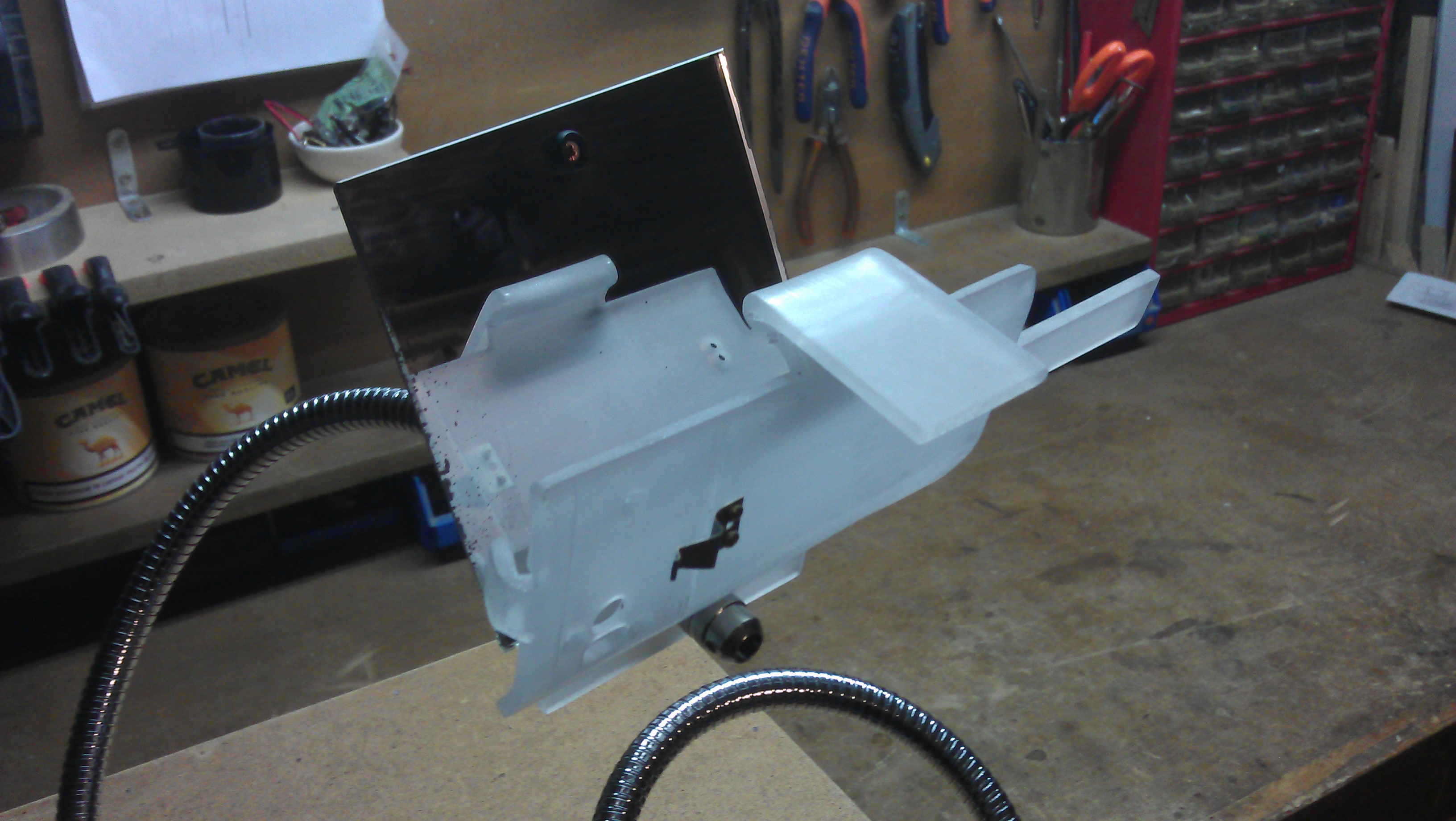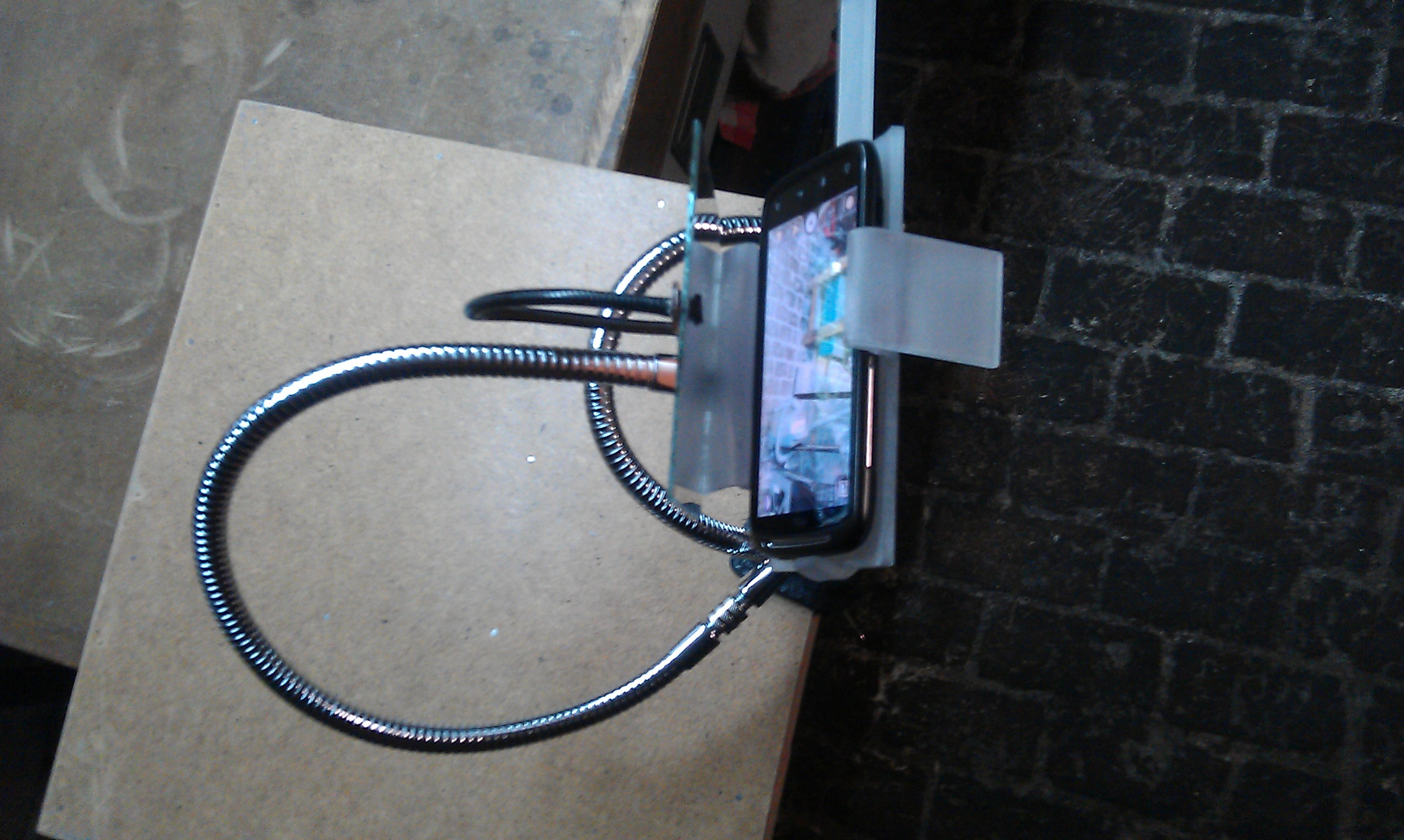 Pour finir et surtout voir ce que l’on filme j’ai ajouté un miroir qui refléte l’écran du smartphone, monté également sur un col de cygne récupéré sur une lampe à led usb défectueuse.