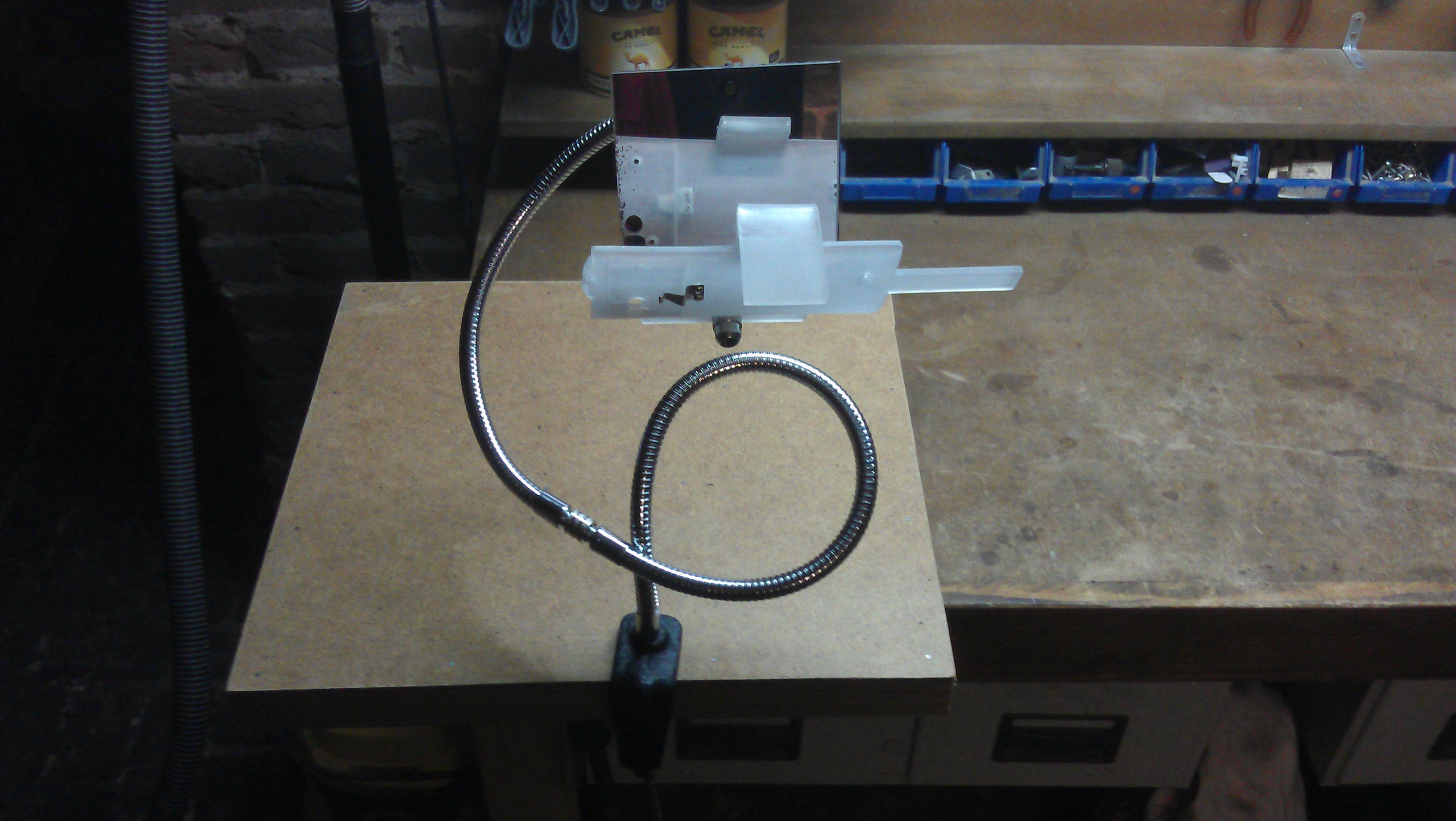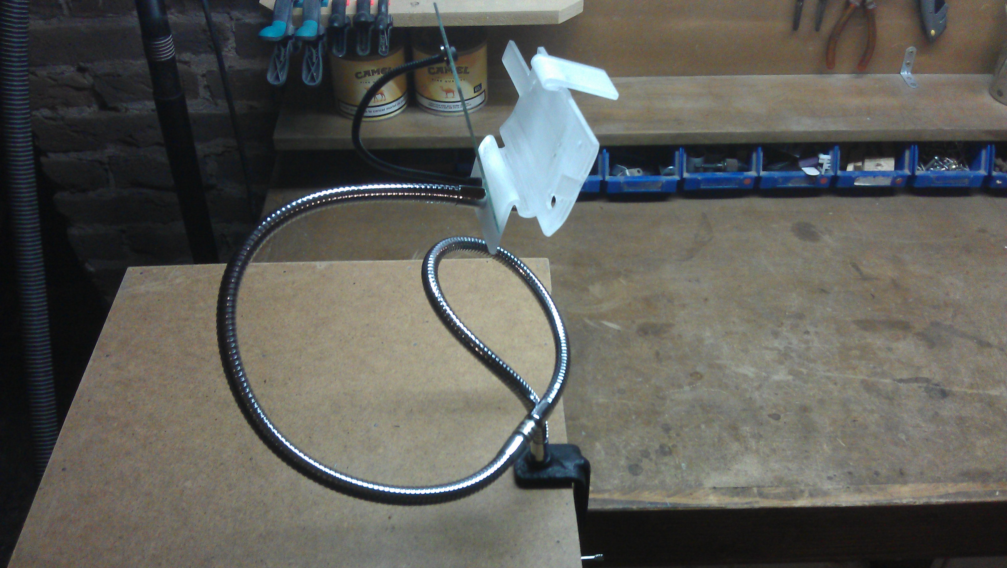 Soucieux d’avoir une parfaite maîtrise du positionnement de l’ensemble, j’ai cherché (pendant un bon moment) un bras flexible et le meilleur compromis à été trouver chez Selectronic sous la forme d’une loupe réglable pour 6€. Elle possède un « col de cygne » de 50cm de long, j’en ai donc pris 2 afin d’avoir 1m au total. Les cols sont pourvus d’un pas de vis à chaque extrémité permettant de les fixer à la fois aux supports et entre eux.